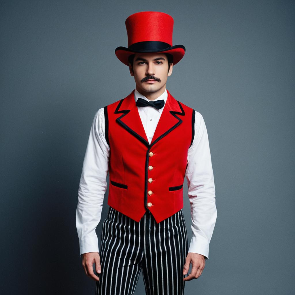 Ringmaster fancy dress man,1boy, male focus, solo, hat, top hat, mustache, striped pants, looking at viewer, pants, facial hair, red headwear, black hair, striped clothes, shirt, long sleeves, jacket, red vest, vertical-striped pants, standing, cowboy shot, red jacket, white shirt, vest, realistic