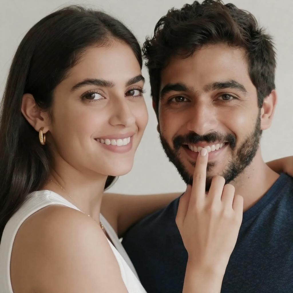 Photograph of a smiling young couple with light brown skin, standing close together in front of a brightly lit window. The man has short, curly black hair, a trimmed beard, and wears a dark shirt. The woman has long, straight brown hair, and wears a purple top. Sunlight creates a glowing effect behind them.