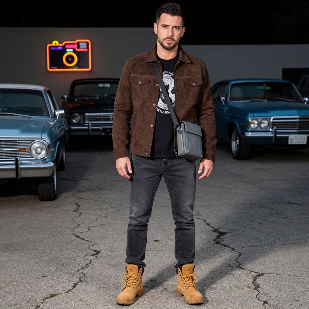 A man, chocolate brown suede trucker jacket, charcoal grey skinny jeans, black graphic tee, tan desert boots, slate grey crossbody bag, neon-lit sign, cracked pavement, vintage cars parked, disposable camera style, relaxed expression Man has masculine face and piercing eyes