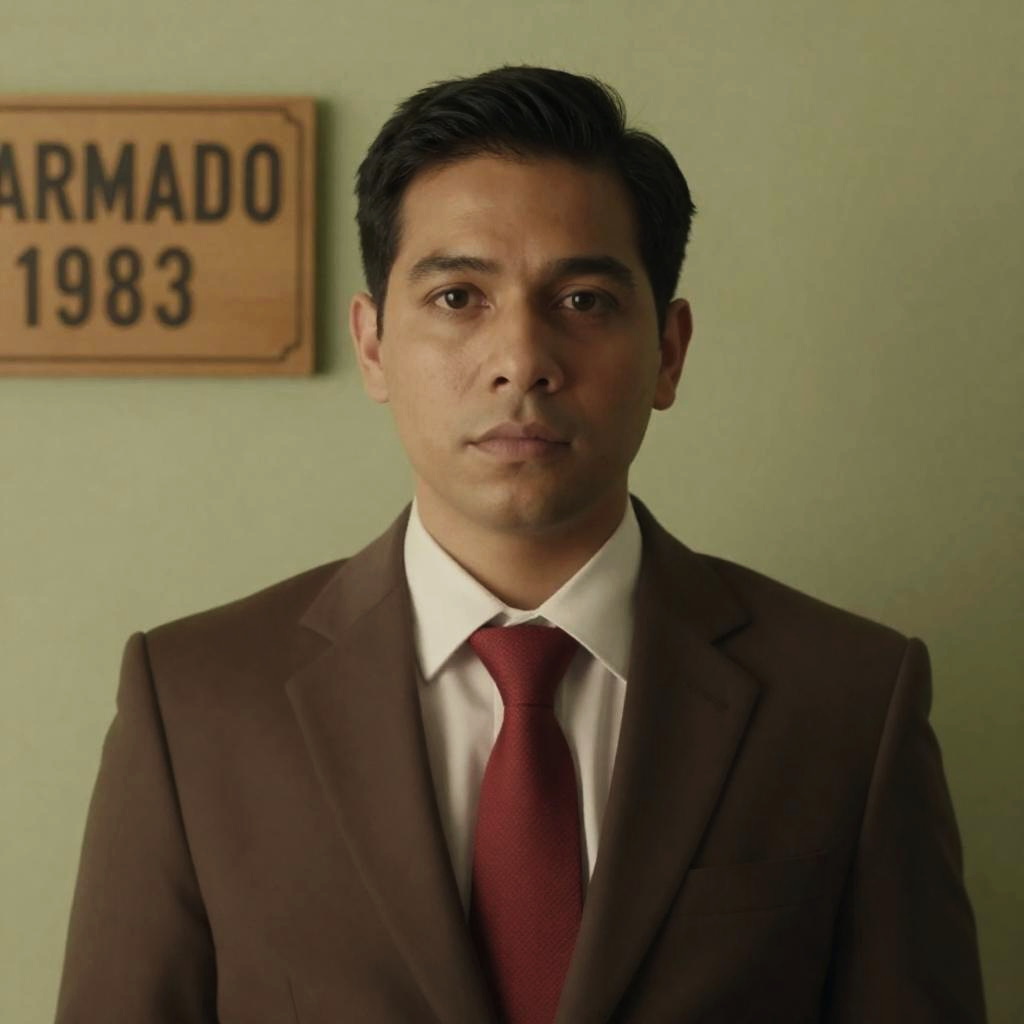 Photograph of a man with short black hair, brown eyes, and light skin, wearing a brown suit, white shirt, and red tie. He stands against a green, ured wall with a wooden sign on the left reading "ARMADO 1983." The man has a neutral expression. The image has a warm, yellowish tint.