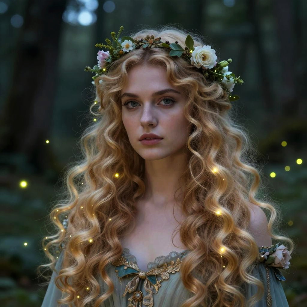 Fantasy portrait of a woman with long blond curly hair adorned with delicate floral wreaths, mystical forest scene in twilight with glowing fireflies, intricate hair details and luminous curls, whimsical and enchanting style