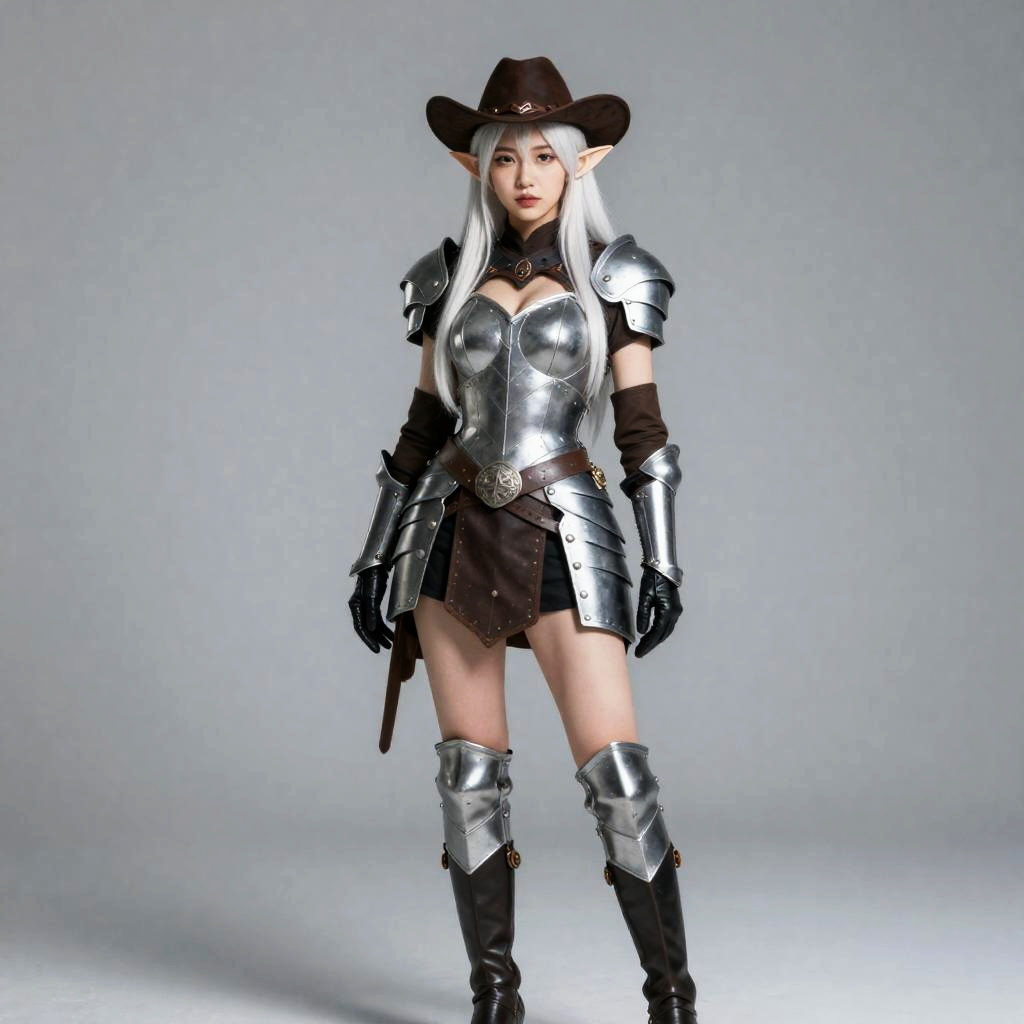 Portrait of an elf woman with long white hair and pointed ears wearing silver medieval-style armor, black gloves, and knee-high boots. She is also dressed in a brown cowboy hat and a leather belt, standing against a plain gray background. The outfit features a combination of fantasy armor and western-style elements.