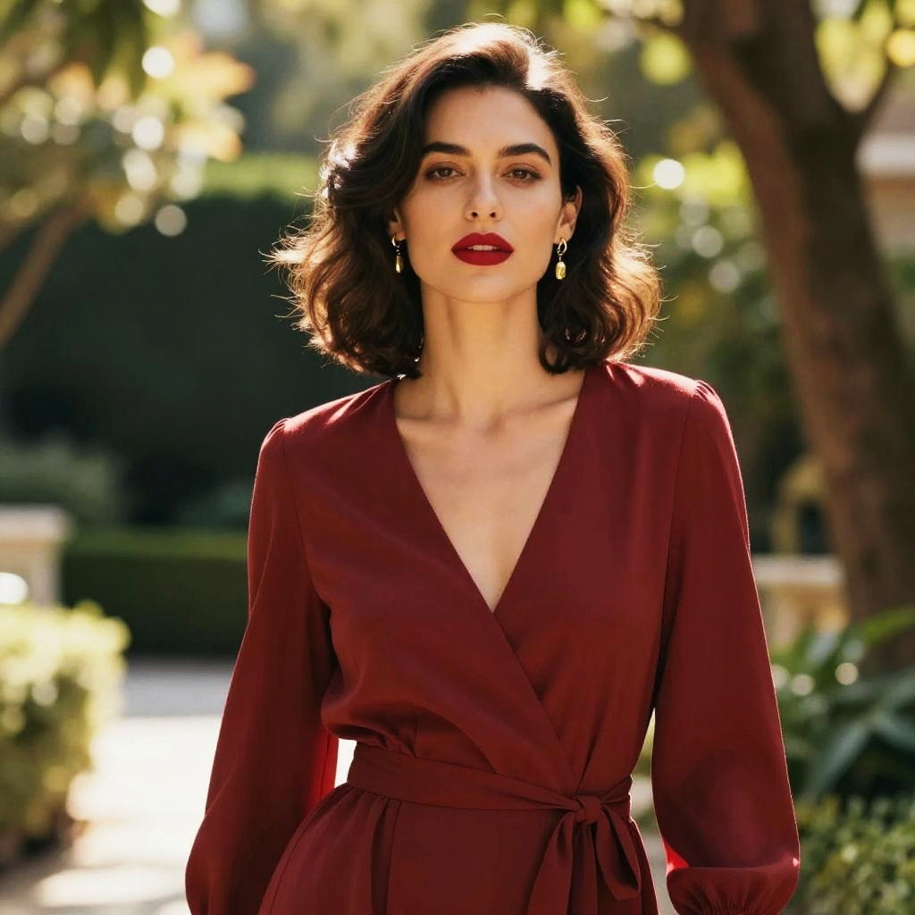 Sensual milf depicted in a flowing silk robe, standing by a large window with natural sunlight streaming through, gentle smile and confident posture, surrounded by lush greenery in a cozy, stylish interior, warm color palette with a touch of vintage charm