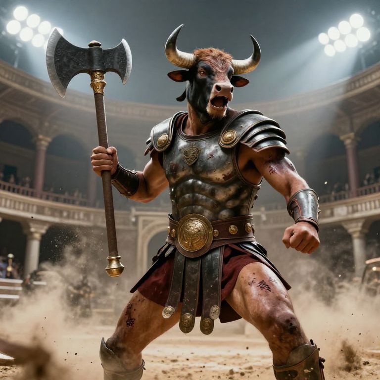 Humanoid bull gladiator in an ancient coliseum, covered in battle scars and armor plates, gripping a massive double-edged axe, roaring defiantly, dramatic spotlight, dust and debris floating in the air, hyper-realistic style