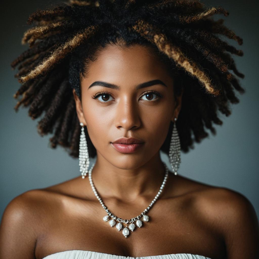 Close-up portrait of a dark-skinned woman with short afro dreadlocks featuring blonde highlights. She has bare shoulders and is wearing a strapless top. The woman is adorned with a pearl necklace and long, dangling pearl earrings, looking directly at the viewer with brown eyes and natural lips. The background is softly blurred, focusing attention on her face and jewelry.
