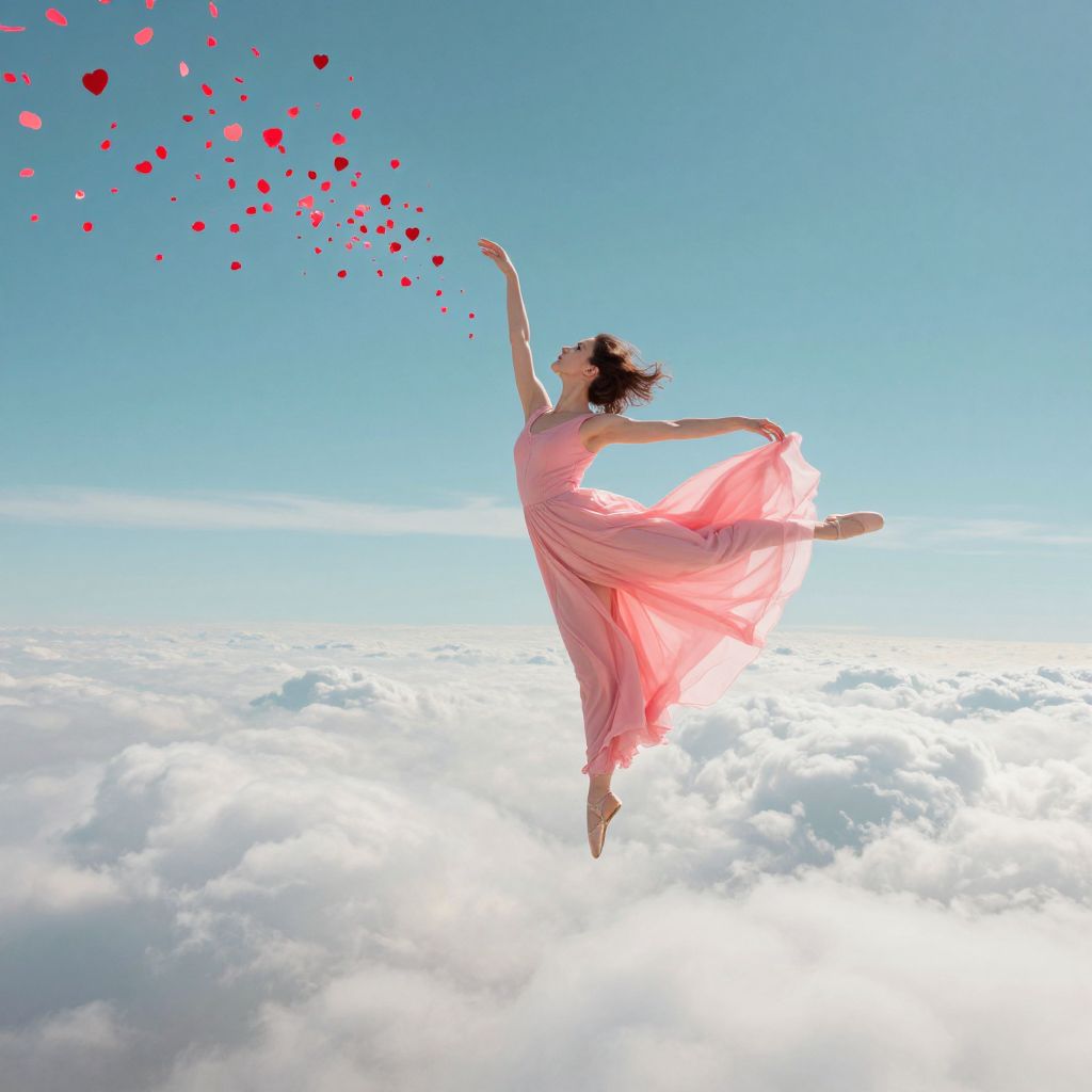 A woman in a flowing pink dress gracefully soars through a dreamy sky, surrounded by vibrant red heart-shaped petals that flutter around her like a whimsical ballet, set against a backdrop of fluffy white clouds and a serene teal-blue horizon.