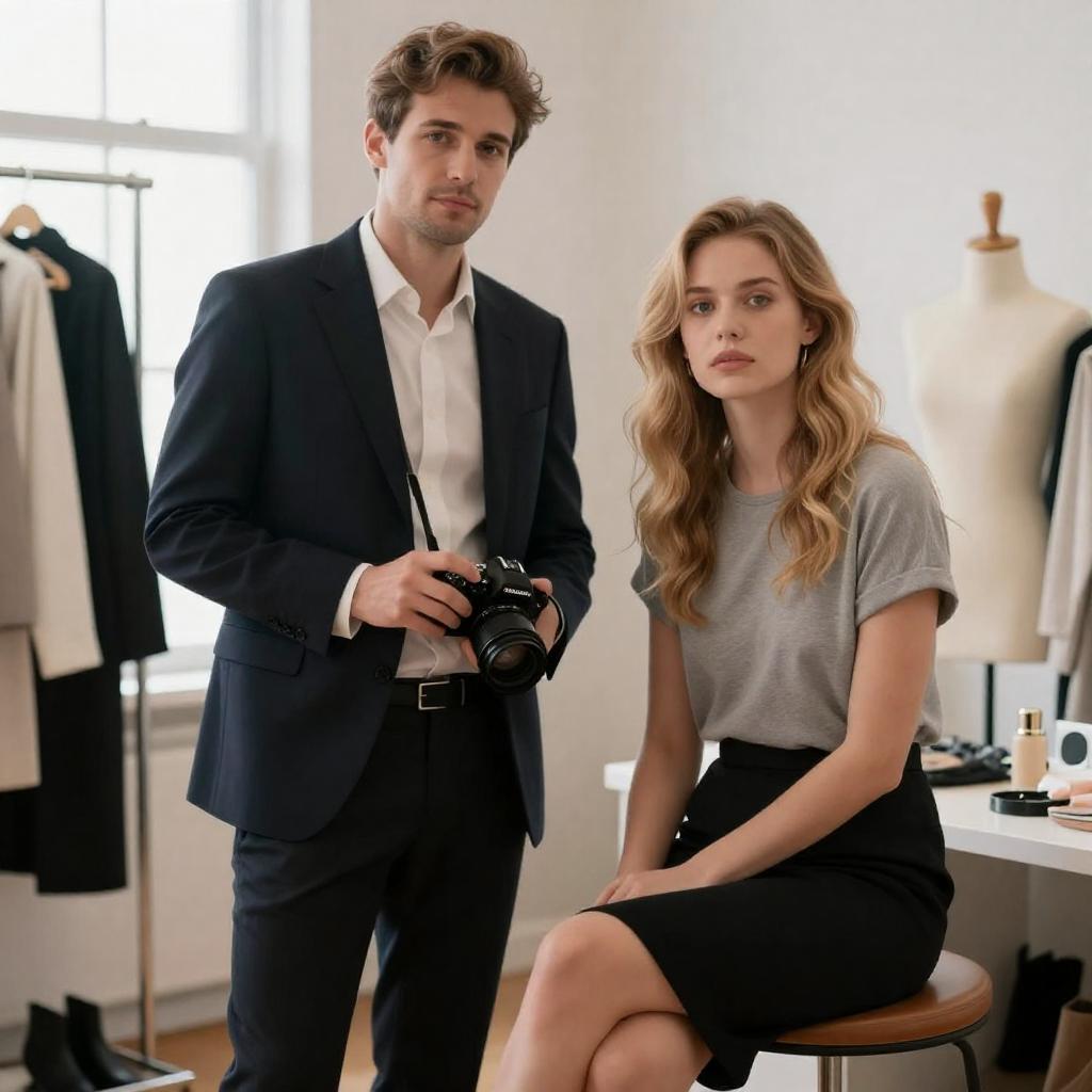 Photograph of a man and woman using a telescope. Man with dark hair, glasses, white shirt, black tie, holding woman's shoulder. Woman with blonde hair, black off-shoulder top, focused expression. Telescope with white and black barrel in foreground. Indoor setting.