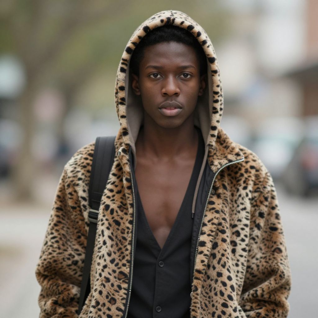 "bugzy malone costume, 1boy, male focus, hood, solo, dark skin, dark-skinned male, outdoors, jacket, blurry, bag, animal print, hoodie Realistic photo of casual sexy person with pretty face"