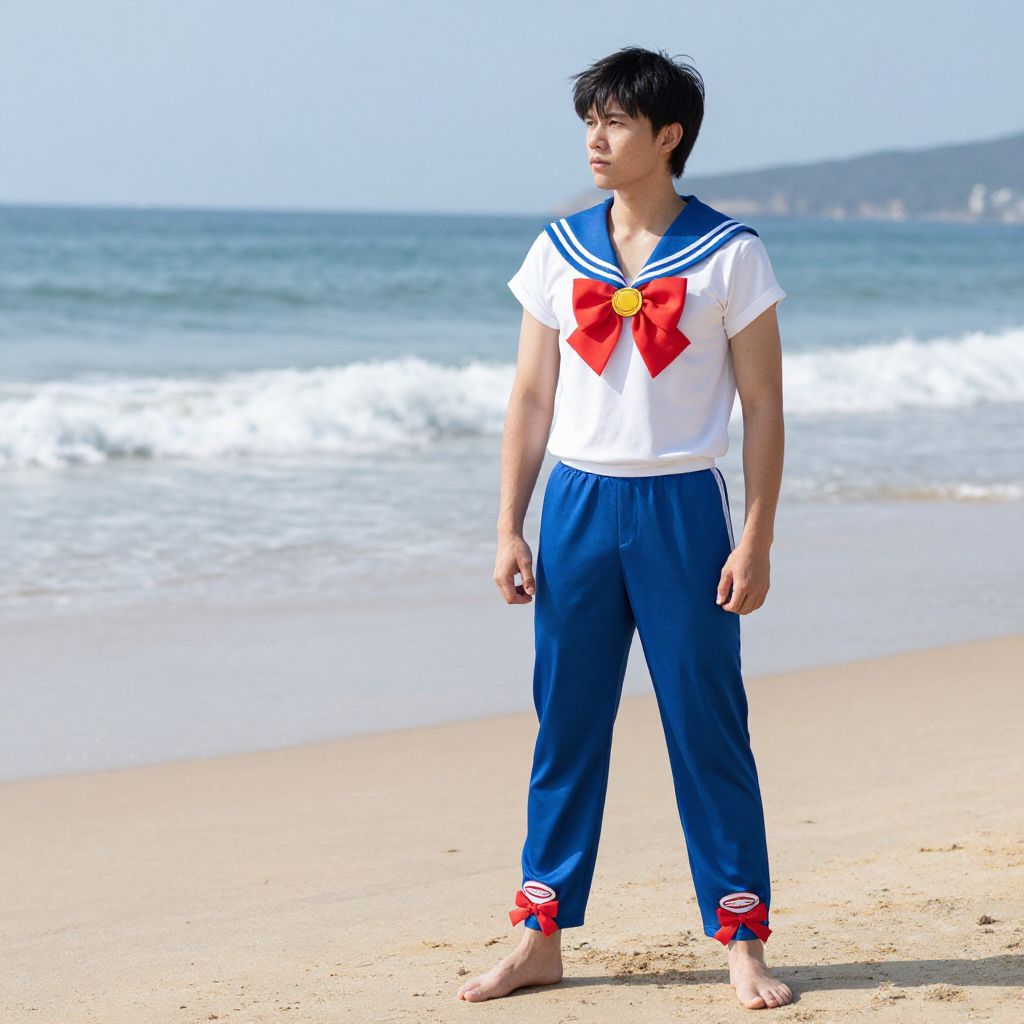 Sailor Moon Costume Man, sailor in a white shirt and blue pants stands on a beach