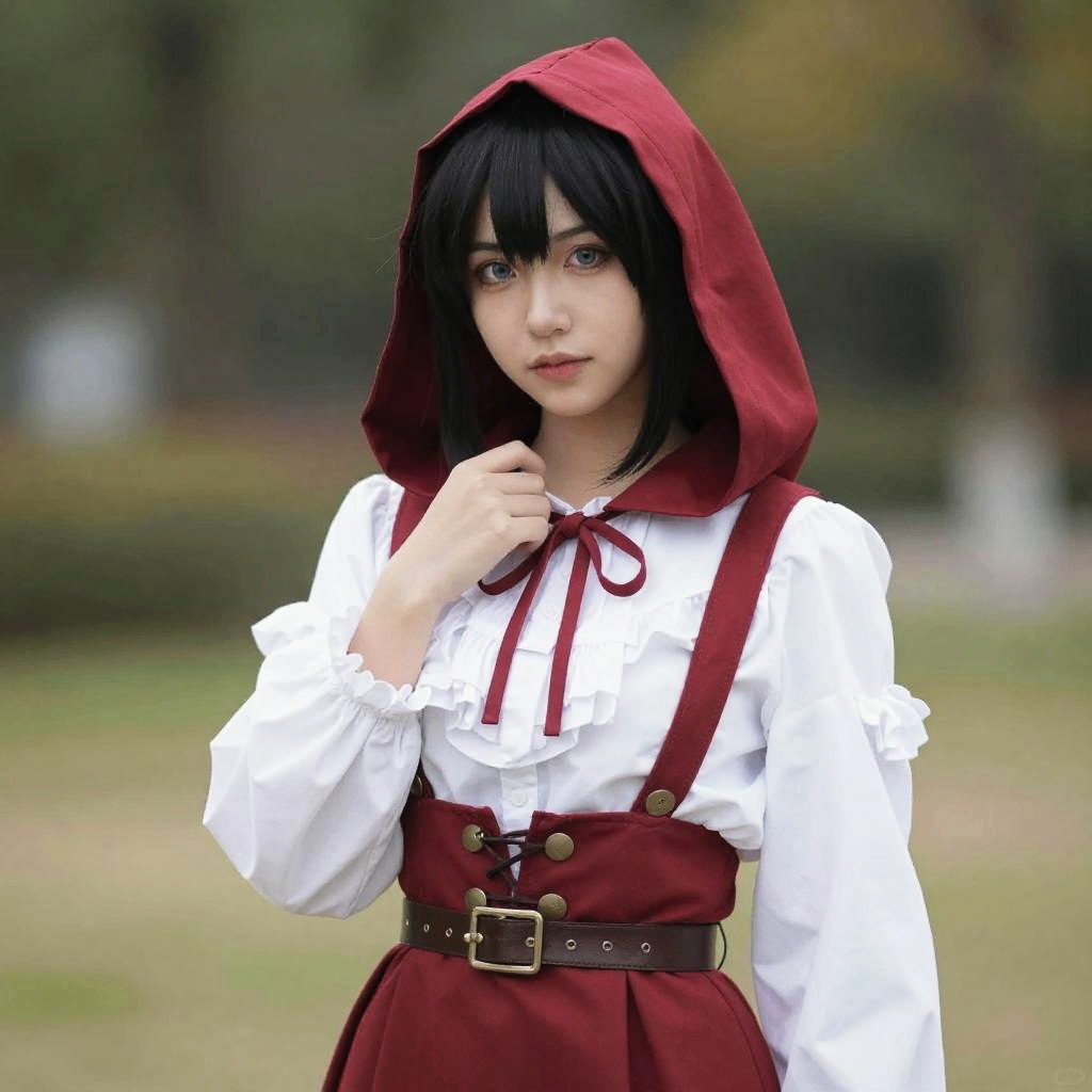 Mereoleona Vermillion Cosplay, woman with red hair and cape posing for a picture in a street