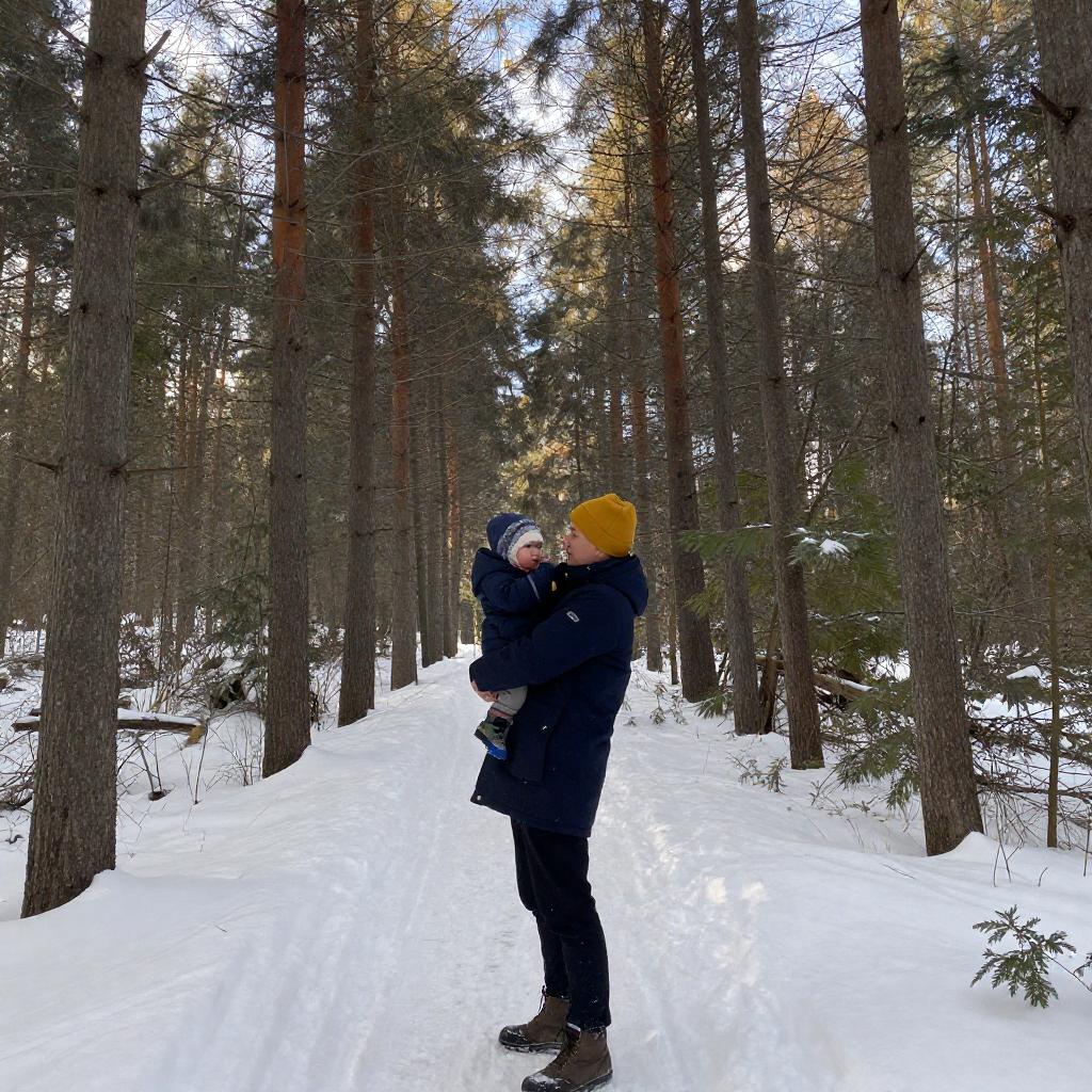 Photograph of a man in a dark blue winter coat and yellow hat, standing in a snowy forest. He is holding a small child in his arms, both facing right. Tall, bare trees with sunlight filtering through surround them, and patches of green foliage cover the snow-covered ground.