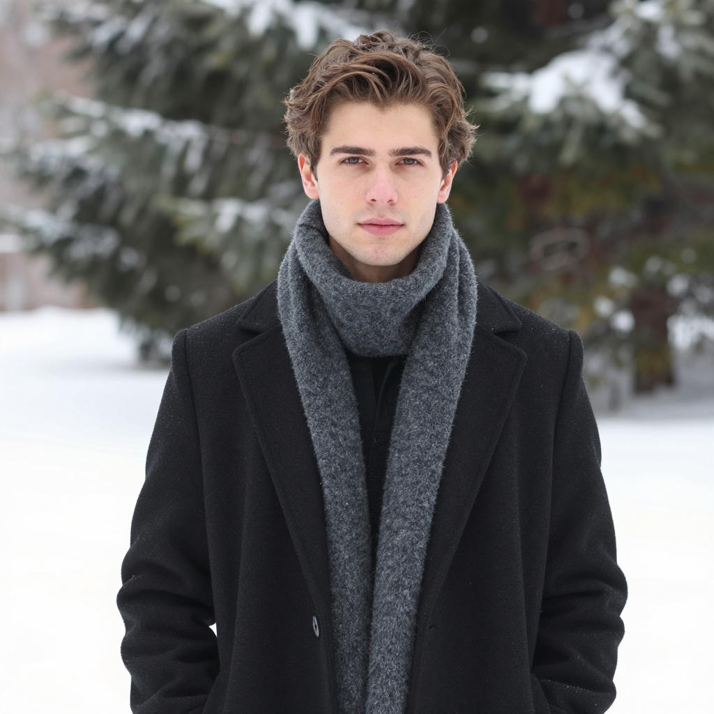 Man with fair skin, brown wavy hair, wearing a black coat with a gray woolen scarf, black shirt, standing in a snowy outdoor setting. Background includes blurred greenery and snow-covered ground. Neutral facial expression. Upper body focused. Blurred background. Snow on evergreen trees in the distance.