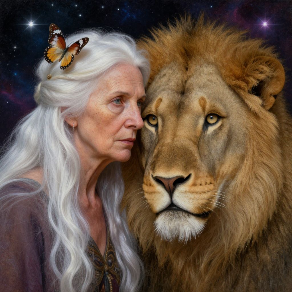Digital artwork of an elderly woman with long white hair, a butterfly on her head, and a lion, both gazing forward, against a starry