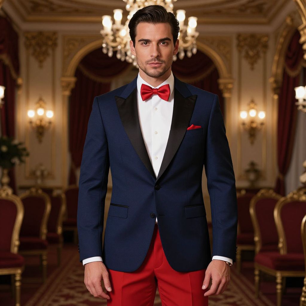 A confident and stylish man, with neatly combed dark hair and a sharp jawline, wearing a dark blue jacket and striking red pants paired with a red bow tie, exuding a sense of sophistication and elegance in a formal, richly decorated ballroom setting.