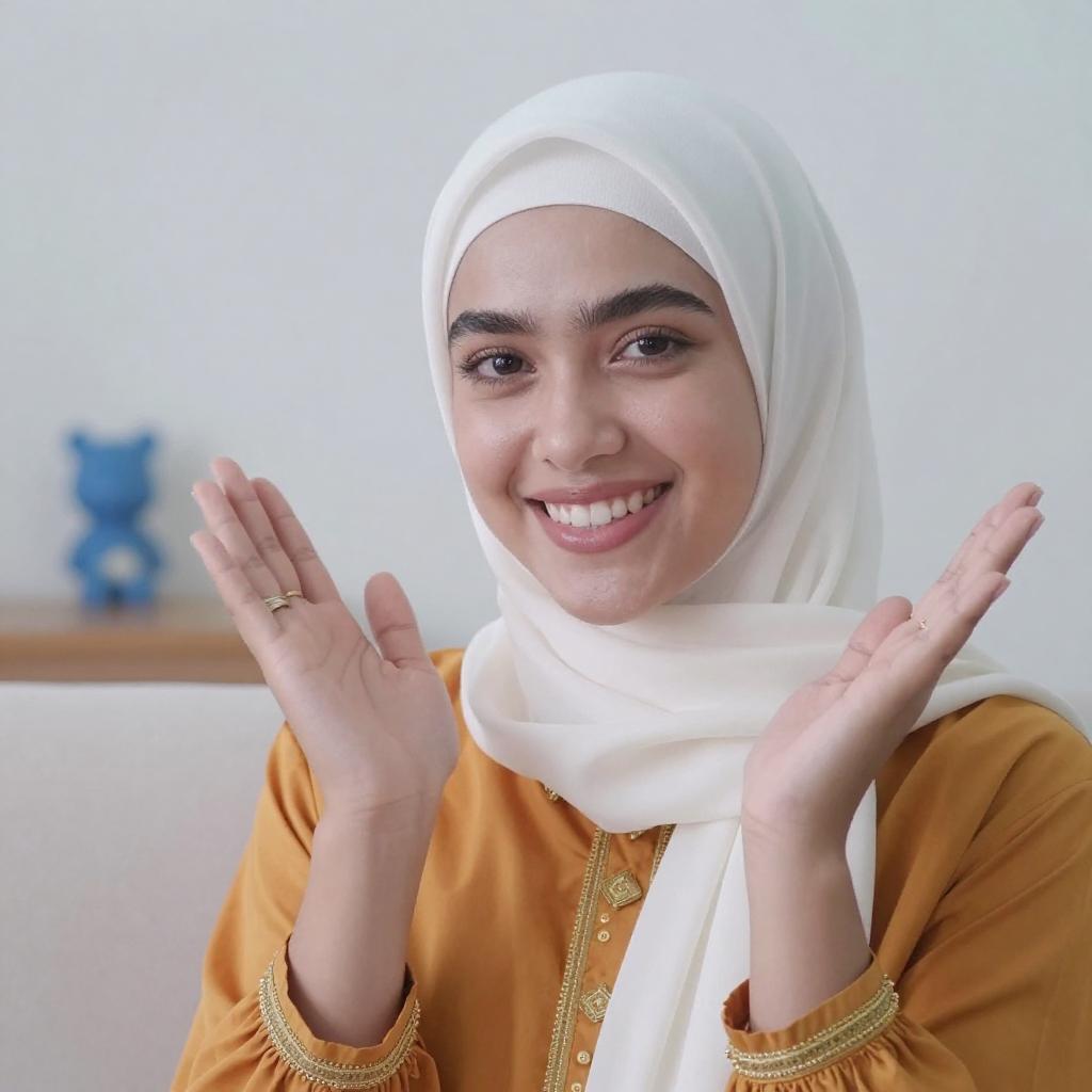 Photograph of a smiling young woman with light skin and dark eyebrows, wearing a white hijab and an orange blouse with gold embroidery. She is seated, raising both hands in a cheerful gesture. A small blue object is blurred in the background. White couch is partially visible behind her.