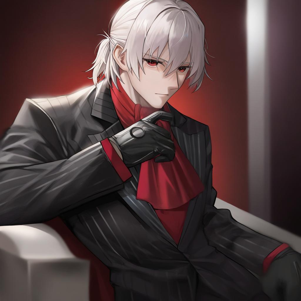 Digital artwork of an anime-style young man with white hair and red eyes wearing a black pinstripe suit with a red ascot and black gloves. The character has a serious expression and is posed against a red and dark background, showcasing formal attire with a half updo hairstyle.