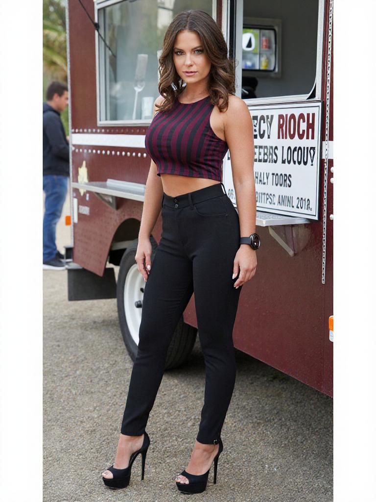 Photograph of a young woman with medium-brown skin and wavy, dark brown hair standing in front of a red food truck. She wears a black and red striped, sleeveless crop top, black high-waisted skinny jeans, and black open-toe high heels. Her right wrist has a black watch. The food truck has white text on its side. A man in a blue shirt and jeans is partially visible in the background. The street is paved, and the overall setting suggests an outdoor event or food festival. The woman's confident pose and stylish outfit draw attention.