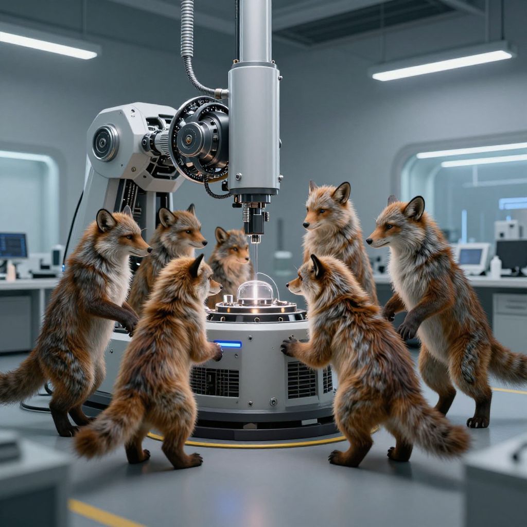Photorealistic CGI: Six fluffy red fox kits surround a futuristic industrial machine with bright lights in a sterile laboratory setting.