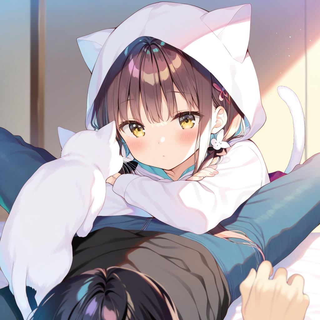 Asakura karen (heaven burns red), heaven burns red, 1girl, cat tail, yellow eyes, long hair, black hair, brown hair, low twintails, blunt bangs, hooded jacket, hood up, white cat, by artist yuizaki kazuya, illustrious