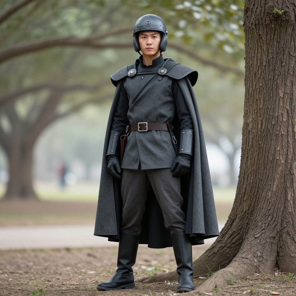 A photograph of an Asian male child standing in a park, dressed as a medieval knight. He wears a black helmet with a silver emblem, a long black cloak with silver buttons, black gloves, and black pants with a brown belt. His expression is serious, and he stands with his feet shoulder-width apart, leaning slightly against a large tree trunk. The background shows blurred trees and a path, with soft, diffused sunlight filtering through the leaves. The child's outfit is detailed with textures, including leather and fabric, adding to the medieval aesthetic.