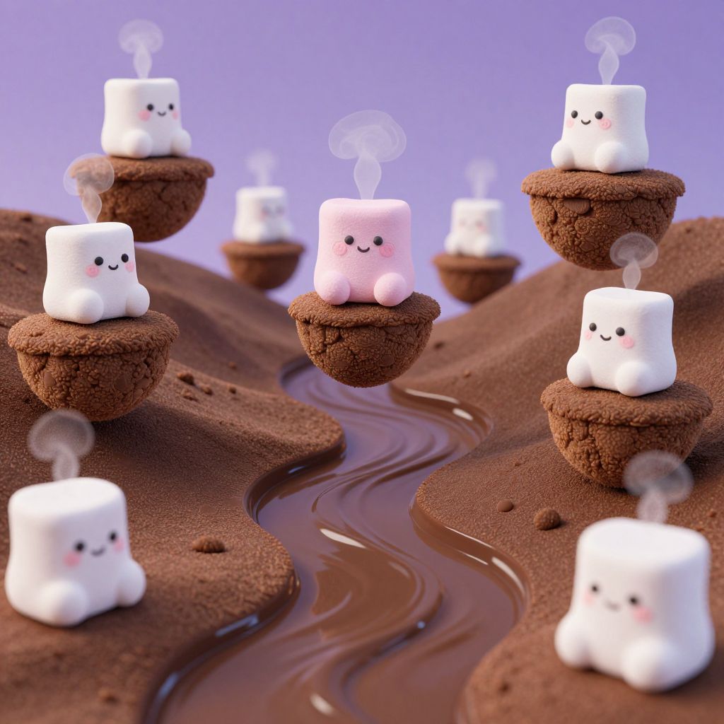 Cute white marshmallow toasts with blushing faces and steam, sitting on chocolate muffins, arranged on a chocolatey landscape with a winding river