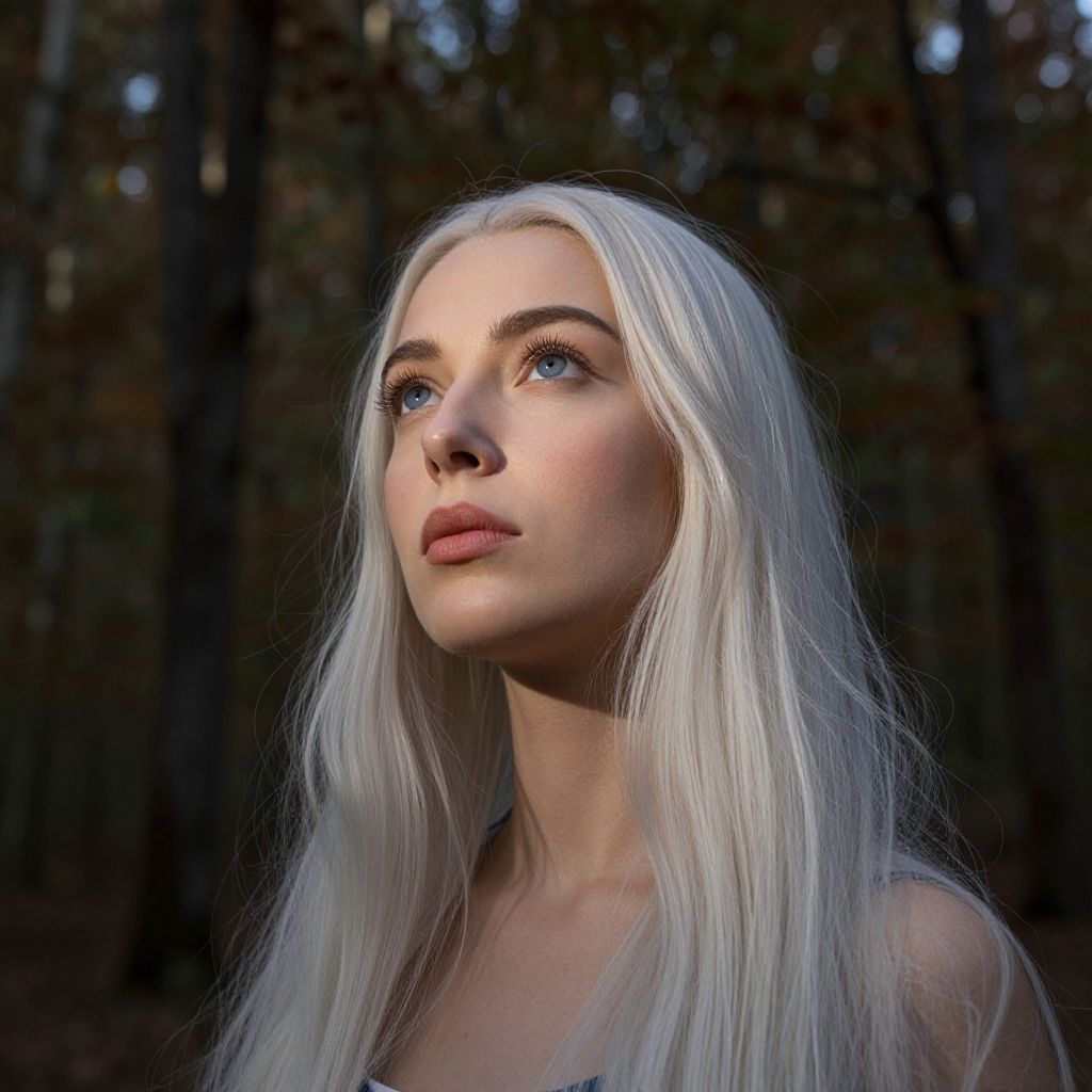 Imagine a portrait photograph exuding an air of mystery, featuring a Middle Eastern woman with striking blue eyes and platinum hair falling gracefully down her back. Captured from a unique low-angle perspective, she gazes pensively into the distance as soft morning light illuminates her fair skin, casting gentle shadows across her high cheekbones and full lips. The dense forest backdrop, tinged with subtle autumnal hues, frames this scene of tranquility and introspection, highlighting her ethereal beauty and enigmatic aura.