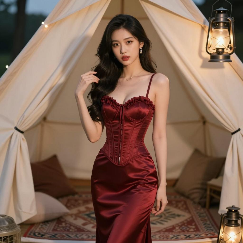 A woman with long dark hair elegantly poses inside a warmly lit tent, wearing a luxurious deep red satin corset dress. The cozy setting is enhanced by hanging lanterns and soft rugs, creating a romantic and vintage-inspired atmosphere.