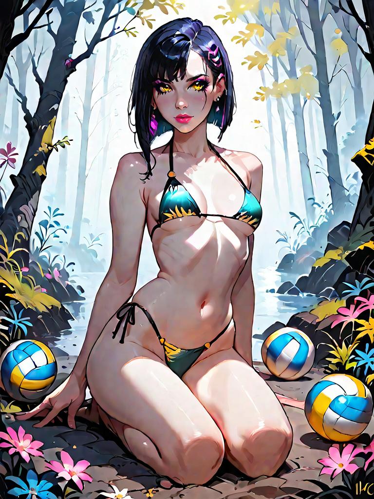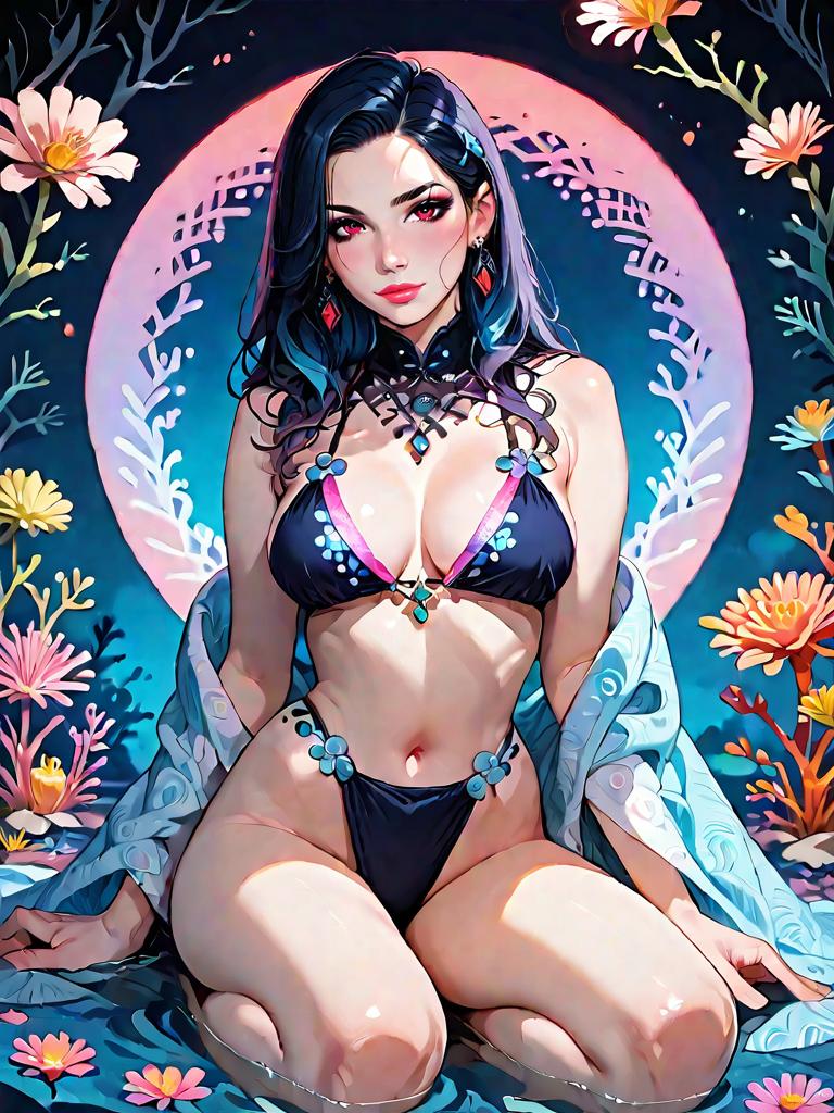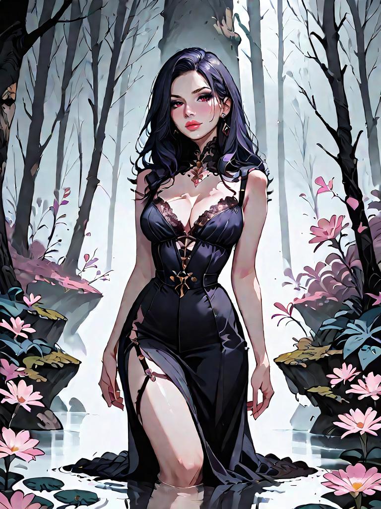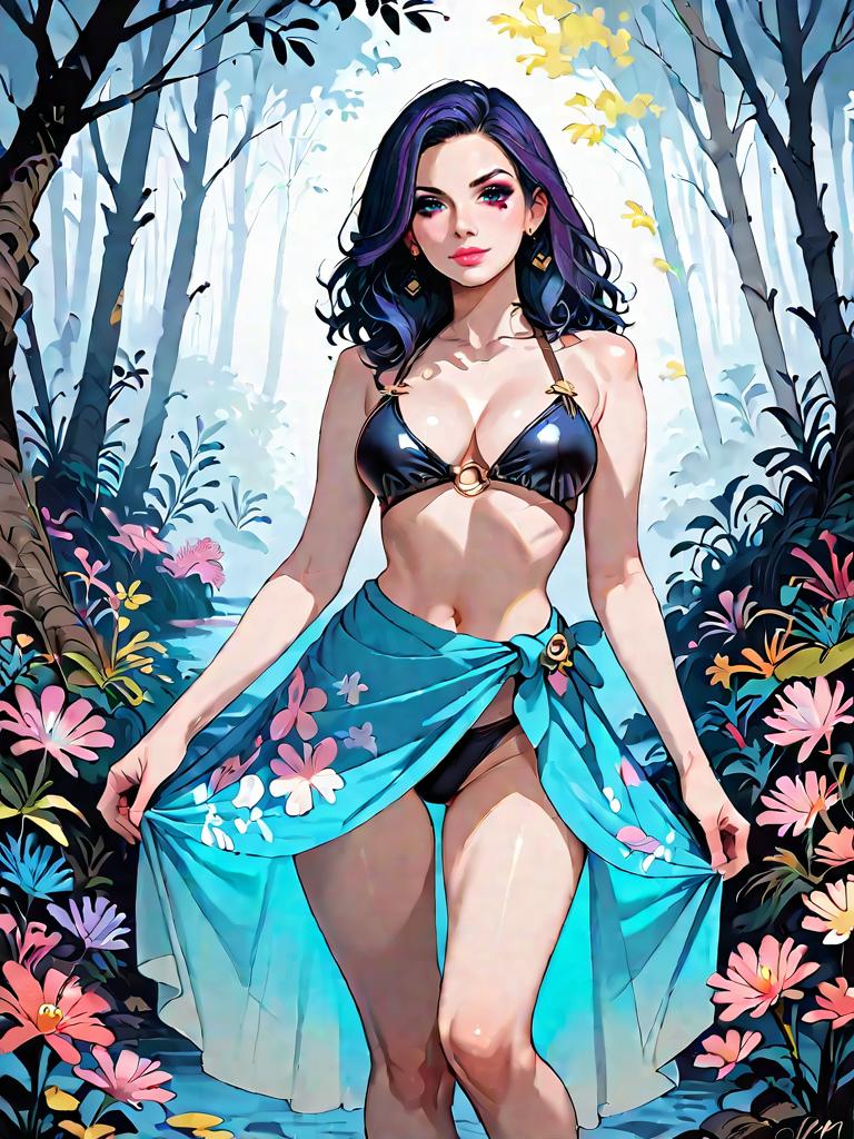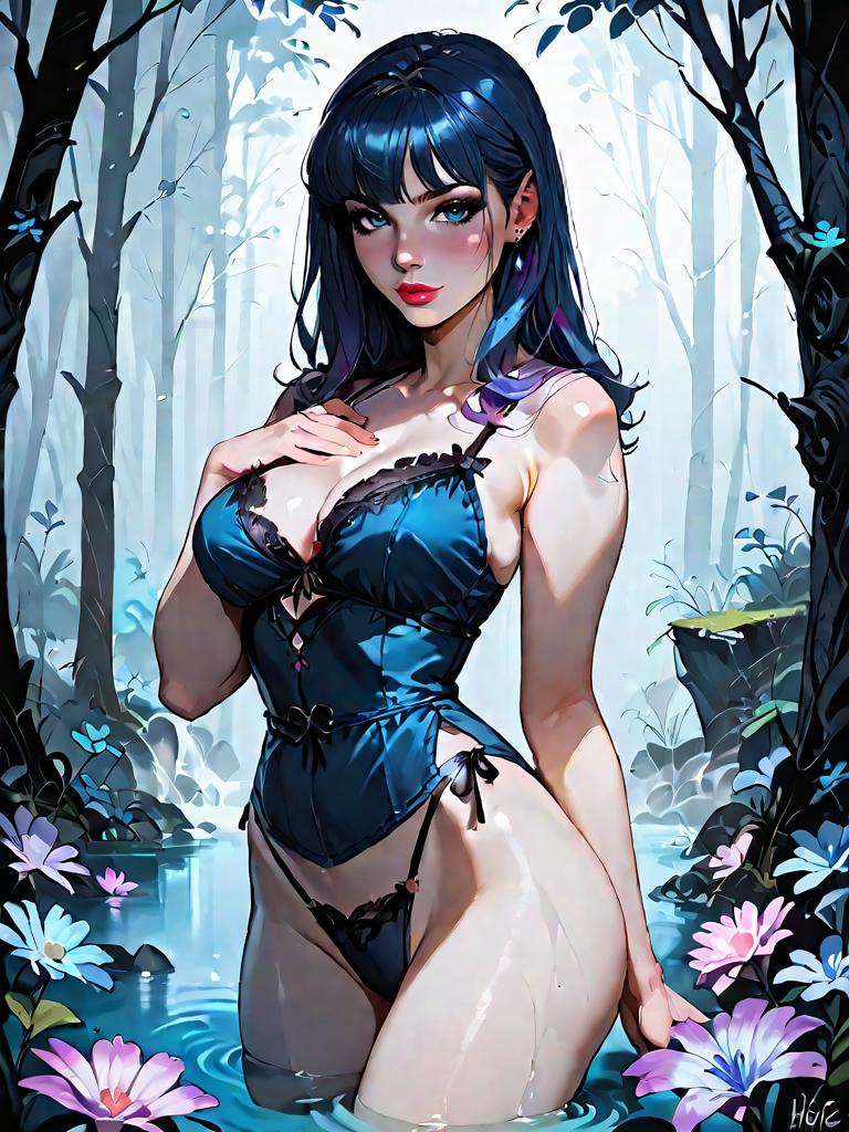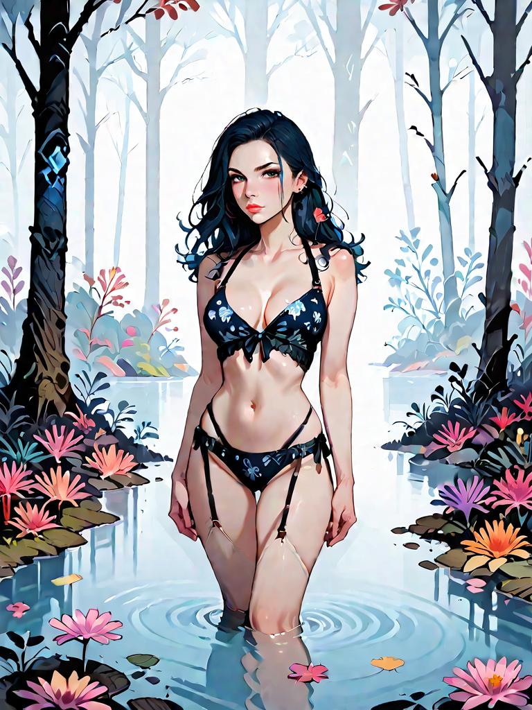 Digital illustration of a fantasy-themed woman standing waist-deep in a mystical forest pond. She has long dark hair and wears a revealing black strappy bikini with high-neck and garter-style stockings. The background features tall trees, vibrant exotic flowers, and soft light mist creating an eerie yet enchanting atmosphere.