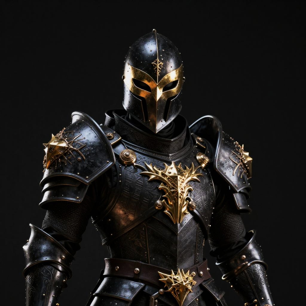 Gilded dark paladin with helmet and mask, all-black armor, intimidating face mask and helmet, plain black background, dark black theme, Pentax K, dramatic, complex details, professional photography, 8k, photo-realistic, octane rendering, global illumination, RTX ray tracing, VFX post-processing