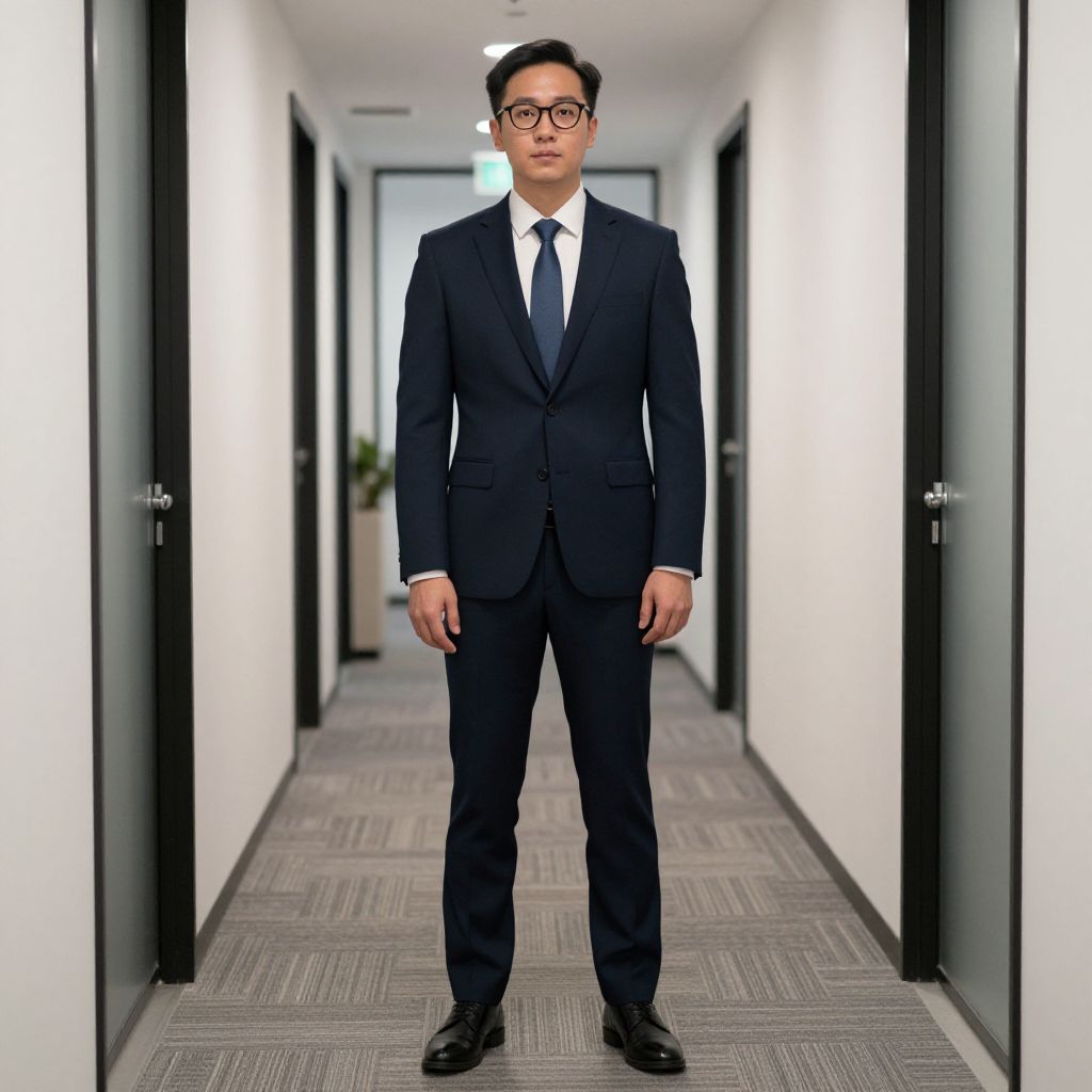 Office Smart Casual Costume, man in a suit and glasses standing in a hallway