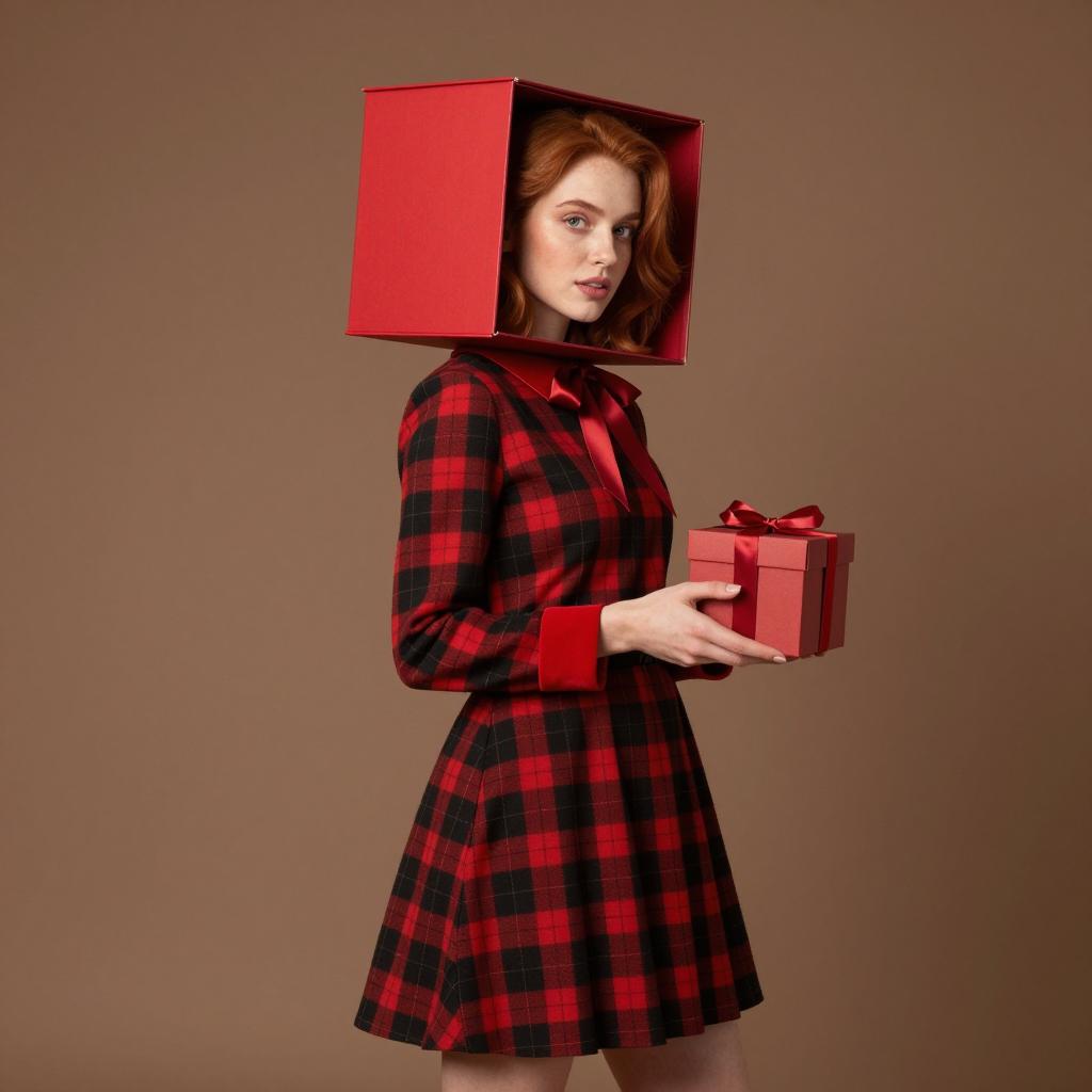 Photo of a young woman with light skin and slim build standing indoors against a white wall background next to a wooden door. She is wearing a red Santa hat, red hoodie with black suspenders, brown high-waisted shorts, and red lace-up boots. The setting features bright natural daylight with clean, minimalist decor.
