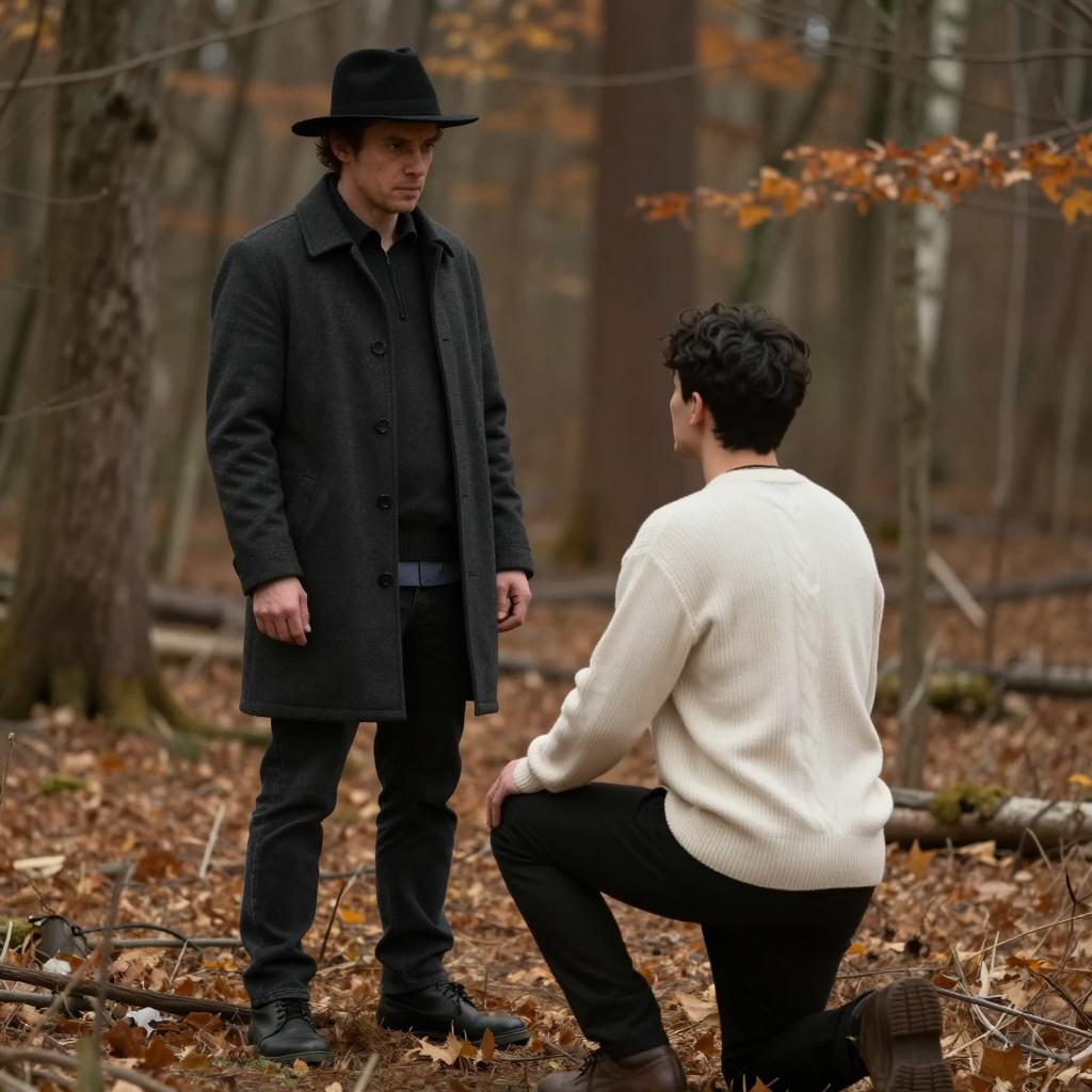 Photograph of two men in cowboy hats and dark clothing standing in a desert landscape. One man wears a long coat, the other a brown patterned shawl. A cactus field and mountains in the background. One man kneels in the foreground. Both men are looking at each other's hands. Sunlit scene with clear blue sky.