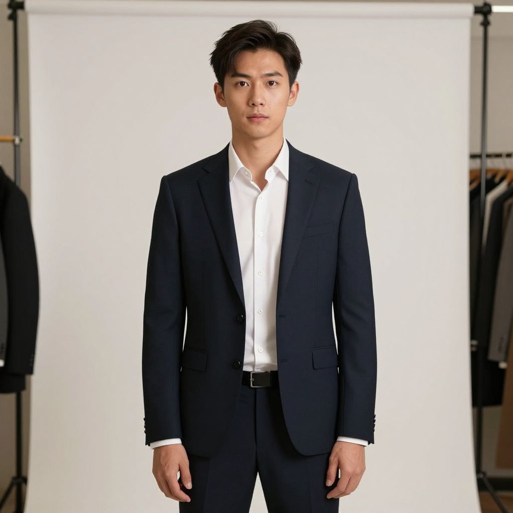 Photograph of an Asian man with short, black hair standing against a white background. He wears a dark navy blue suit with a white dress shirt, unbuttoned at the top. His expression is neutral, and he stands with his arms relaxed by his sides. The background includes blurred black and grey clothing on hangers, suggesting a clothing store or studio setting. The lighting is even, highlighting the crispness of his suit and the clean background. The overall style is professional and minimalist.