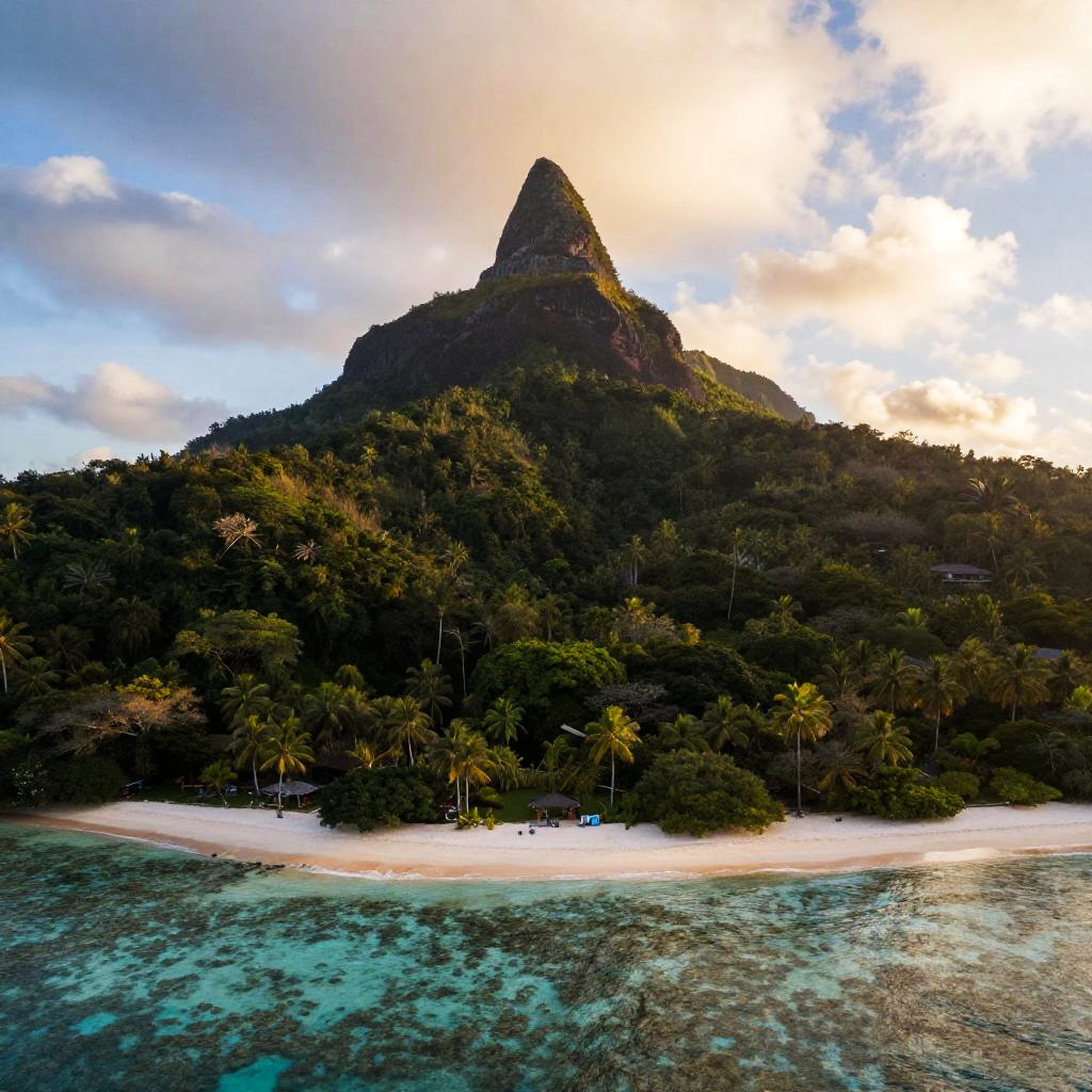 Aerial view of tropical island mountain, dramatic rocky summit rising above emerald jungle, vibrant coral reefs framing white sandy beaches, golden hour lighting, cinematic atmosphere