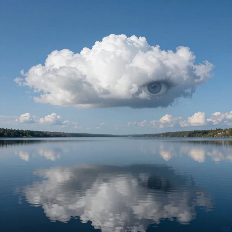 Clouds shaped like staring eyes drift above a mirrored lake that shows not your reflection, but visions from parallel lives you never lived.