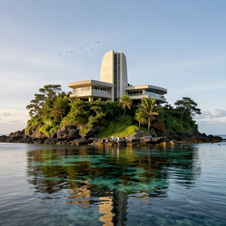 Modernist architecture stands majestically atop a tranquil island, surrounded by lush greenery and mirrored by cascading kelp forests beneath the crystal-clear waters, as three figures traverse the rocky shoreline under a serene sky dotted with birds.