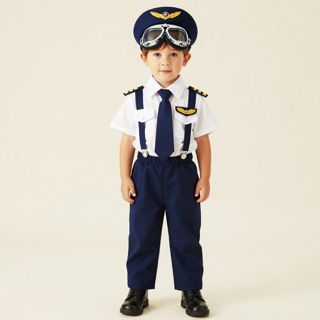 Pint Size Pilot Costume Toddler, boy wearing a pilot's uniform and goggles