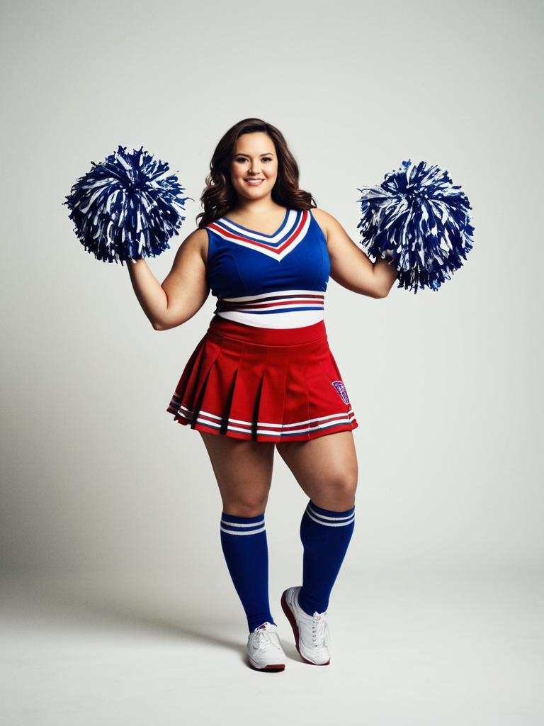 Woman in Plus Size Cheerleader costume, photorealistic full-body portrait in studio