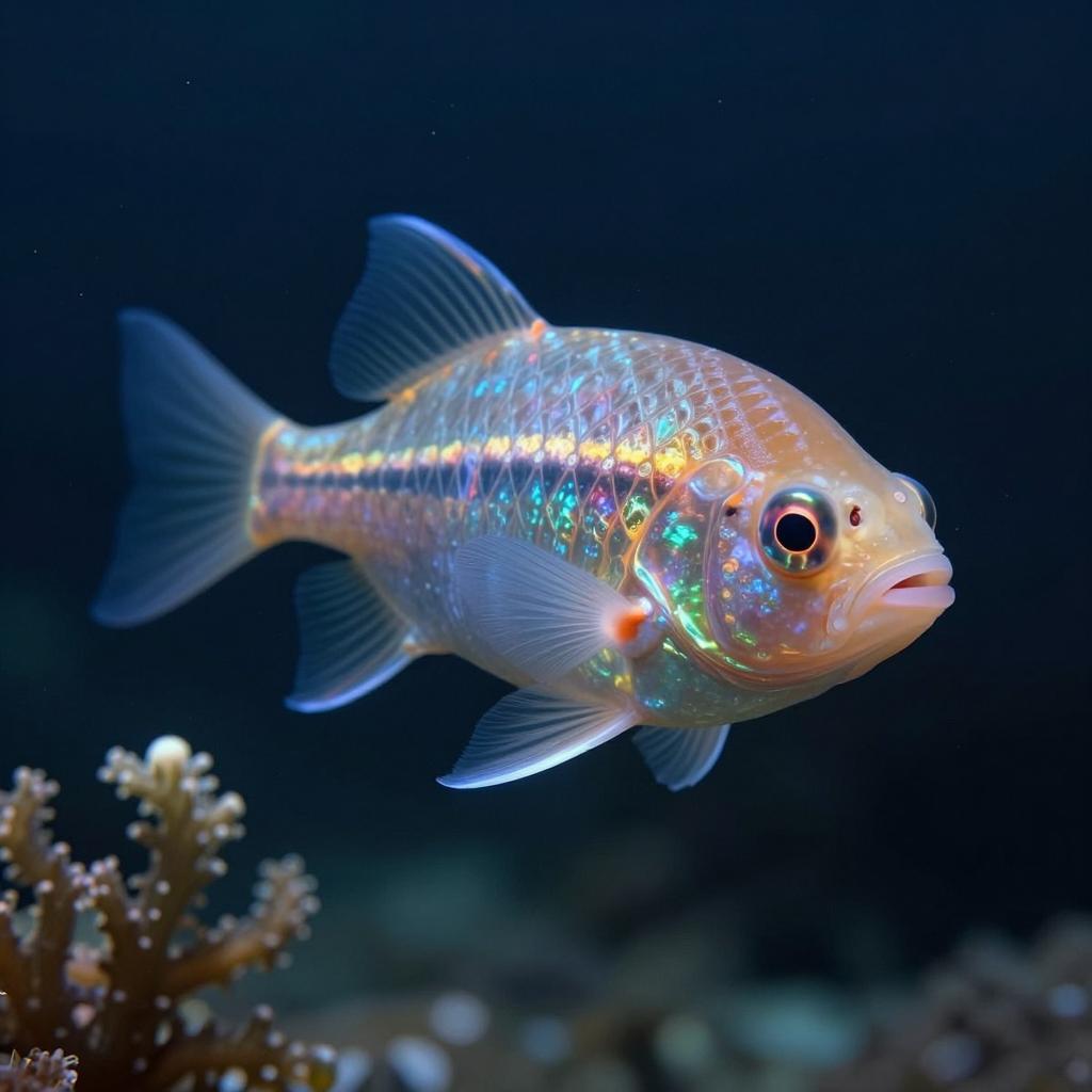 Digital photo of glowing bioluminescent deep sea alien fish in dark underwater abyss with floating alien flora, showcasing skin textures like slimy translucent skin with iridescent scales. Captured in Professional Wildlife Photography style, ultra HD, realistic outer space wildlife portrait with shallow depth of field and dramatic lighting.