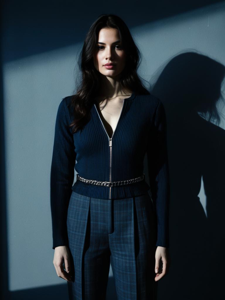 Portrait of a woman wearing a black ribbed knit top with a deep plunging neckline and silver zipper detail, long sleeves, paired with high-waisted tapered plaid trousers in dark tones. She accessorizes with a chain attached to the belt loops. The image features a plain white studio background and dramatic lighting casting a shadow on the wall.