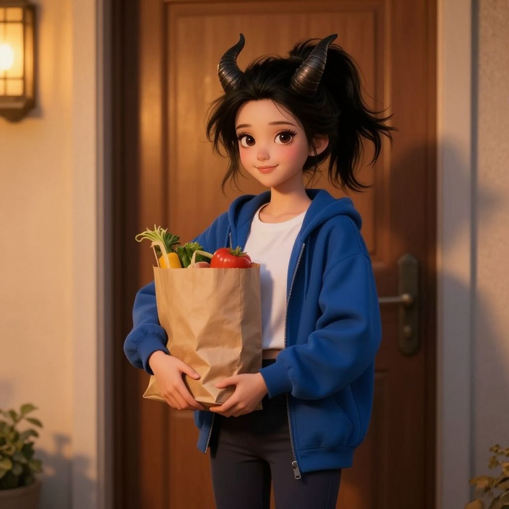 Masterpiece, (6:00 pm) partly, light winds, oncoming dusk, amber glow, Rembrandt lighting, photorealistic, sharp focus, from a standing position, 1girl, 26-year-old succubus, (cute: 1.5) (petite: 1.3), black hair, (messy ponytail: 1.3), (small: 1.8, subtle horns), (tiny body: 1.5) (160cm height: 1.5) (small breasts: 1.5) With Thick Eyelashes, small mouth, (realistic skin texture: 1.3), dark hazel eyes, (extremely delicate: 1.3), standing at the (front door), holding a (brown paper bag) of groceries, wearing a ((blue (pull-over: 1.3) jacket) a (white shirt: 1.5), and and (dark-grey stretch pants)), (amused, loving smile)