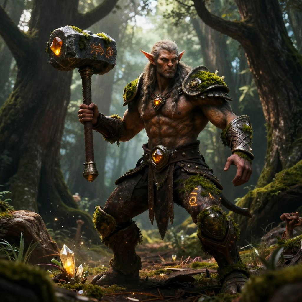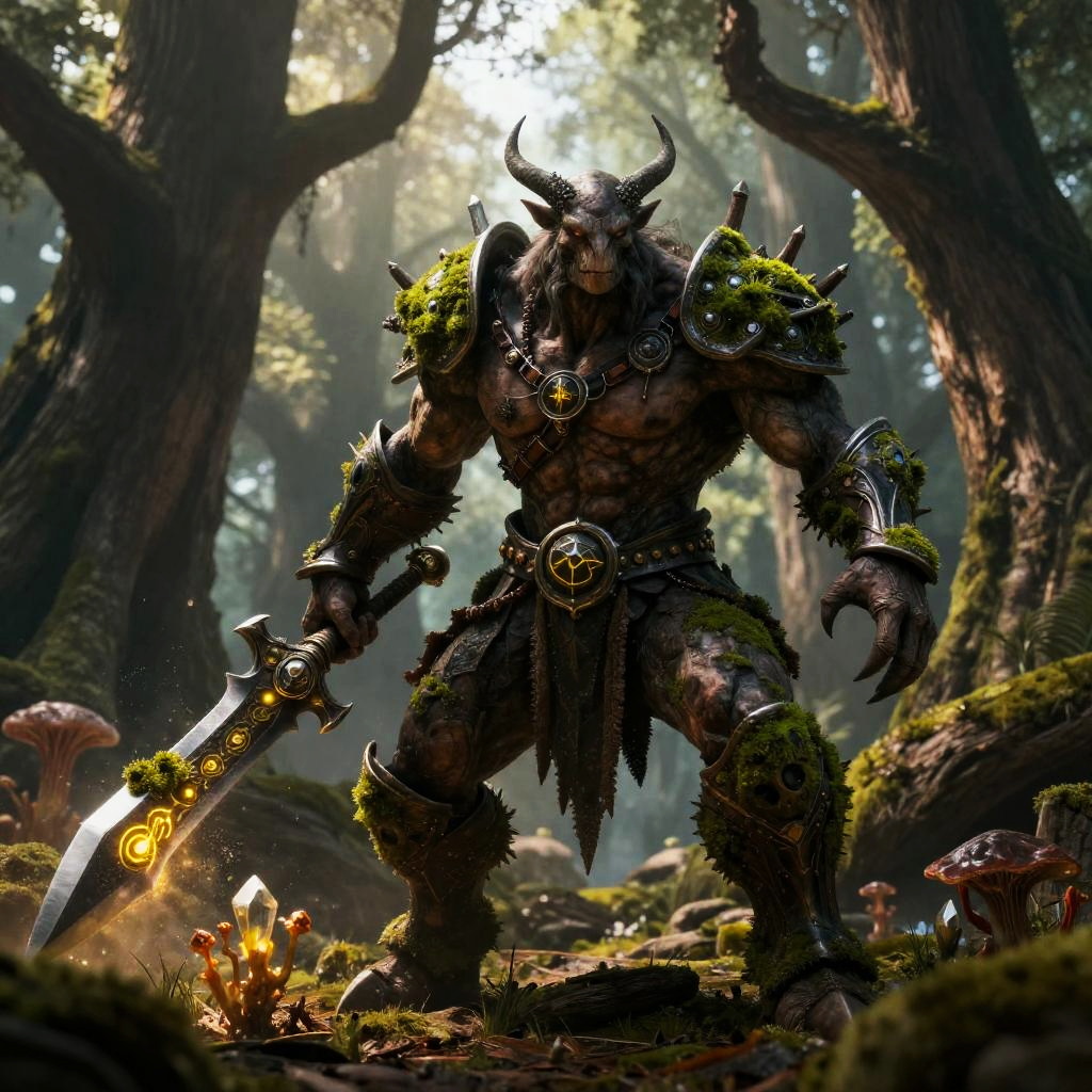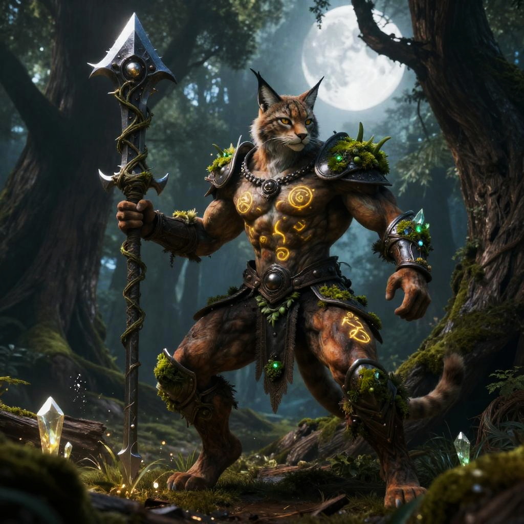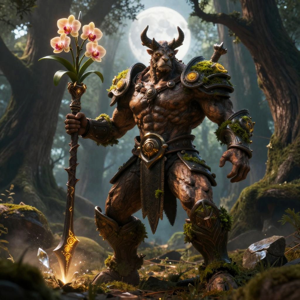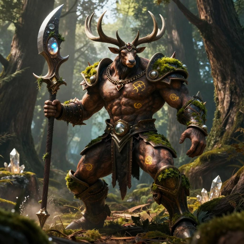 Muscular muscular sylvan naga-warden in rugged petrified bark and moss-covered armor, wielding a spiked basalt halberd wrapped in living ivy and luminescent lichen, standing in an ancient forest with towering oaks. Powerful stance, radiating root and crystal magic with glowing yellow runes and crystals. Cinematic lighting, battle-ready pose, Unreal Engine render, 8K, volumetric shaders, splash screen, cover art.