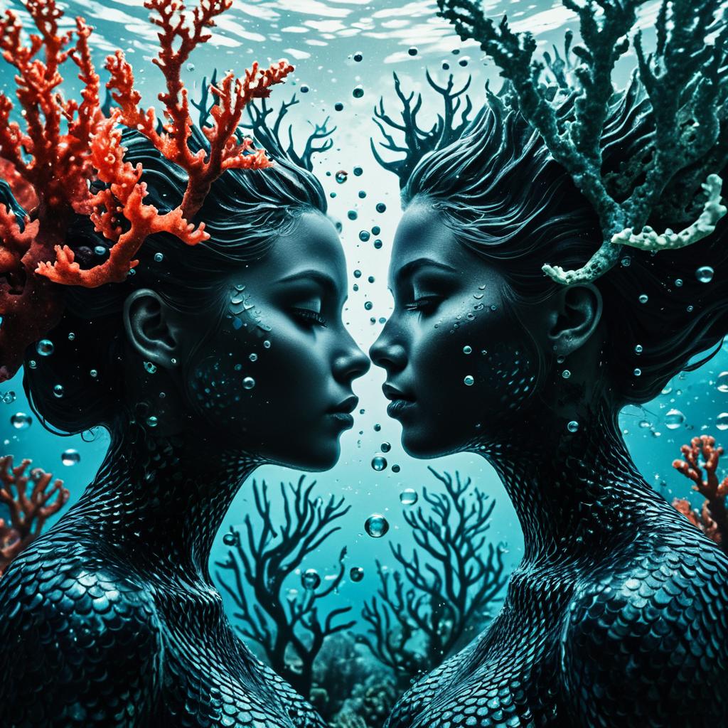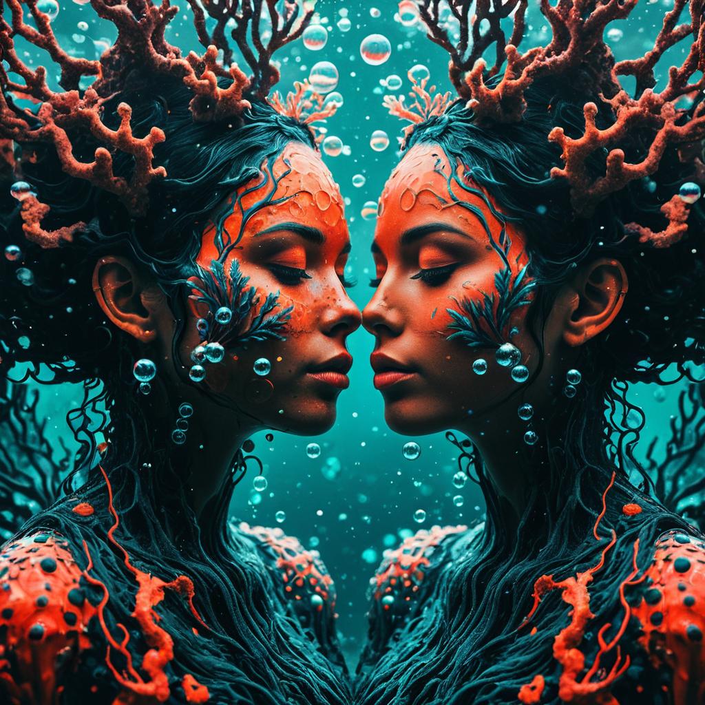 3D head shot intricate portrait of the beautiful two nymph female face silhouettes mixed with liquid acrylic paint and smoke, elegant, abstract art, surrounded by coral reefs, bubbles, seaweed, concept art, epic, octane render, composition by Beeple