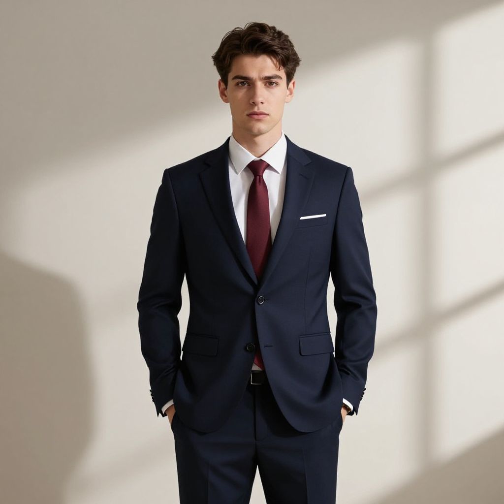 Photograph of a young, attractive man standing indoors against a plain, light-colored wall with shadows from a window. He has short, dark brown hair, a serious expression, and is wearing a dark navy blue suit with a white dress shirt and a maroon tie. His hands are casually in his pockets, and he stands confidently with a straight posture. The lighting highlights his features and adds depth to the image.