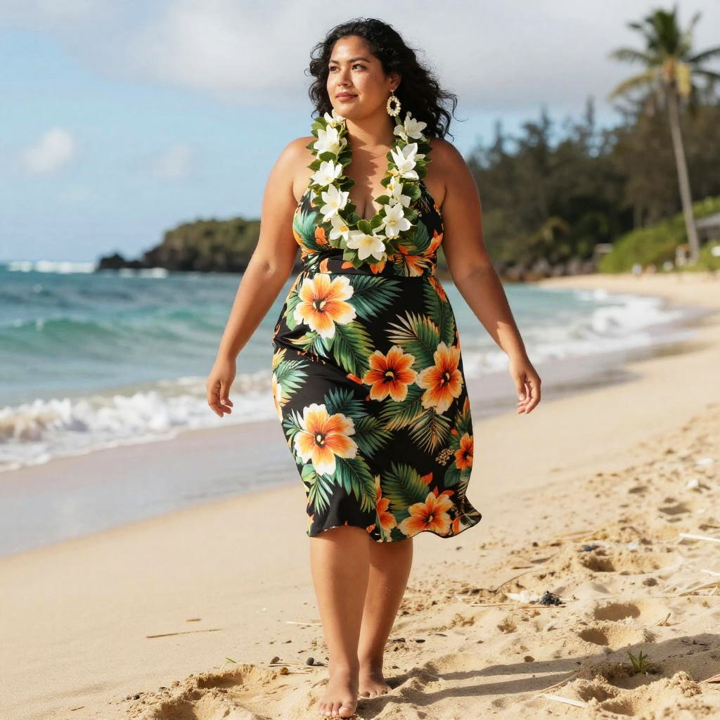 Hawaiian Fancy Dress Plus Size, a woman in a floral dress standing on a beach