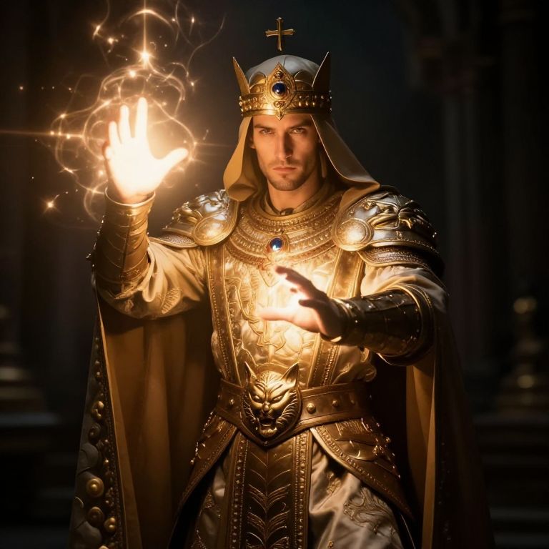 Panning A mighty king, in golden robes, glorious and infinite. He wears a crown of jewels. His eyes glow like the sun. When he speaks, his words echo louder than thunder.,