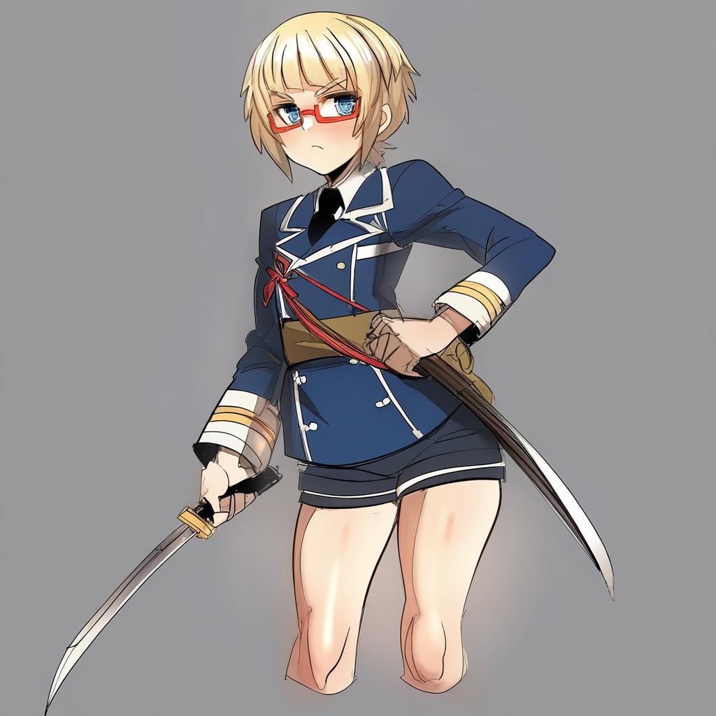 Digital artwork of a blond anime boy wearing red-framed glasses and a blue military uniform with white trim and a black necktie. He holds a Japanese tantou sword in one hand and has a serious expression. The character wears matching blue shorts and is posed against a plain gray background.