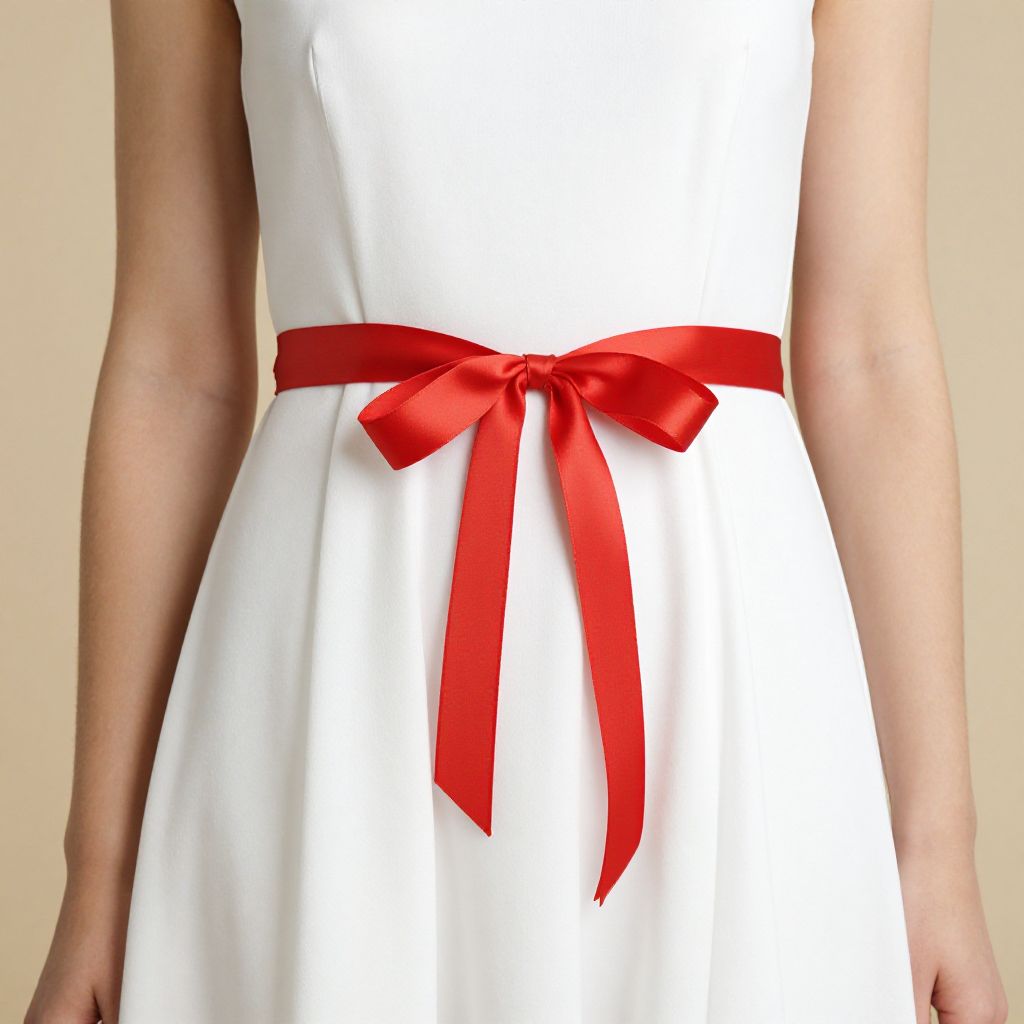 Photograph of a person wearing a white dress with a vibrant red satin ribbon tied in a bow at the waist.