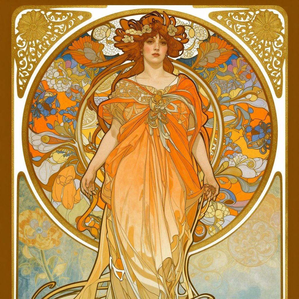 A stunning Art Nouveau-inspired digital illustration featuring a woman in a flowing orange gown, set against a vibrant circular backdrop with floral motifs and intricate gold detailing, evoking the elegance and ornate style of Alphonse Mucha's masterpieces.
