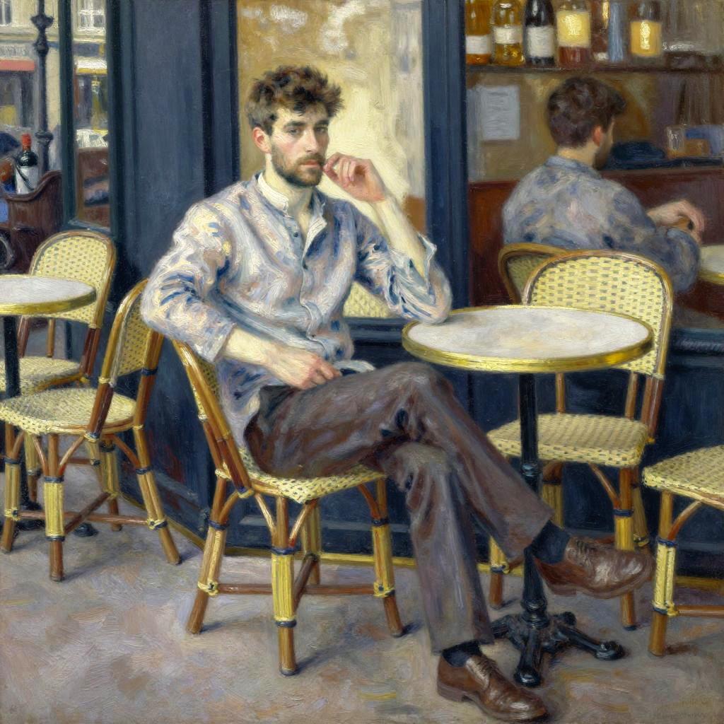 This digital painting depicts a young man with dark curly hair and a beard, sitting at a small round table in a café. He wears a blue and white striped shirt, brown pants, and black shoes. His right hand rests on his chin, and his left hand is on the table. The café's chairs and table have a classic French design, with yellow woven seats and dark wooden frames. In the background, another person with short brown hair is seated at another table. The café's glass windows display shelves with bottles, and the floor is a light, textured stone. The painting uses a vibrant, impressionistic style with bold colors and visible brush strokes.